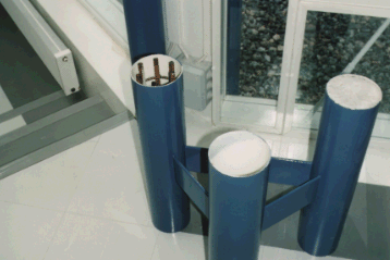 仕上げられたプラスチクッス材は鉄筋コンクリートの型枠としても使われている。柱としてのパイプは2本あるいは3本をプラスチクッスのプレートで連結して、このプレート部分に開口パネルなどを挟み込んでいる。