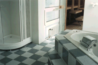 浴室の床はリサイクルプラスチックスを使ったタイルで仕上げられているが、サイズが大きすぎて変形が大きく、床面がでこぼこしまっている。