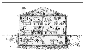 10.システムに接続された全ての機器と装置は、スイッチや他のコントロール機器から指示を与えることができる。寝室のスイッチや電話からでも、毎日夜になると全てのドアや窓の鍵を締めるようにすることもできるし、朝の目覚しをステレオ装置に指示し、さらにコーヒーメーカーを作動させることもできる。1階の暖房を起きる30分前に上げて置くようにすることもできる。
