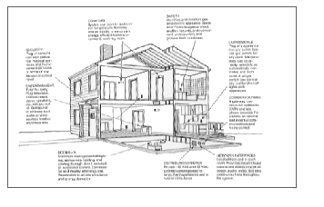 図4はスマートハウスの姿の一断面を示したものである。この図は後で示されるダイアグラムに示されているシステムの各々の部分が、住宅で実際にどう配置されるか読者が心に描くのを助けてくれるだろう。