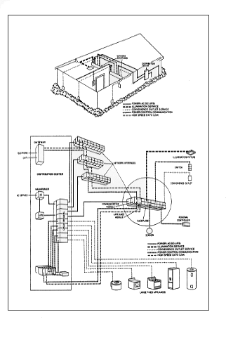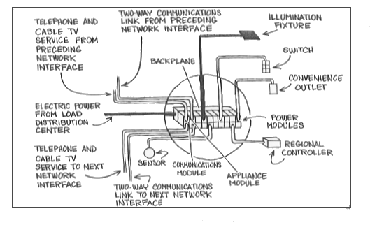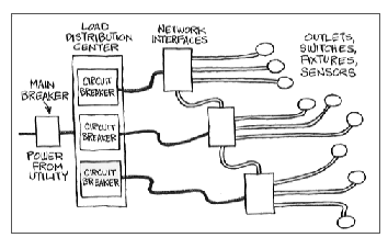 (内部コミュニケーションシステムのための配線に加えて、このケーブルにはテレビのための同軸ケーブルとオーディオの伝送用の線とが加えられているが、しかしコンビニエンス・アウトレットにつながっている正式なスマートハウス・ケーブルには含まれる電力線は必要ないだろう。)後で示すように照明、スイッチ、機器、センサーや局所コントローラは、すべてこの通信ネットワークに情報を供給することになる。