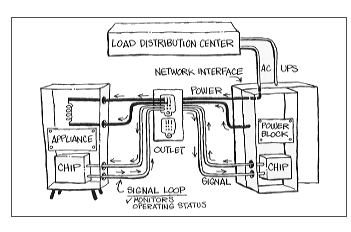 図の下の部分に示されているように大型の据付設備は、専用線で回路遮断器から直接電力の供給を受けることになるだろう。しかしながらこうした機器は、図の左下のコーナーに示された専用ネットワーク・インターフェースによって制御されるだろう。