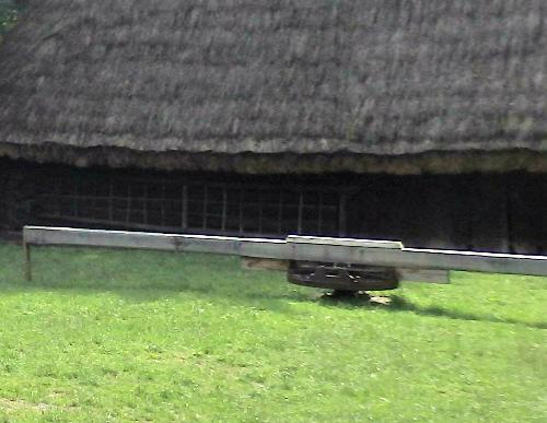 八角形の納屋は松の丸太組みでできていて、垂木構造の、藁葺きの屋根で覆われている。