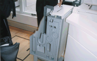 発泡床ブロックは30cmの格子状に溝が作られている。この溝を使って給水、給湯などの配管が行われる。配管システムはフレキシブルで簡単に接続できるよう工夫されている。配管の変更も容易でまたその都度配管を固定する必要もない。またこの床の溝はバスタブ、シャワーパンなど設置の際の位置ぎめおよび固定にも使われる。