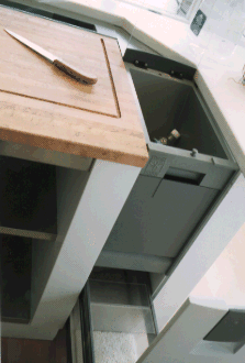 ワークトップの脇にはボトルや食品包装用プラスチックスのリサイクルユニットが組み込まれている。バーコードリーダーがエンジニアリングプラスチックスと汎用プラスチックスとを識別し、エンジニアリングプラスチックスは粉砕されストックされる。