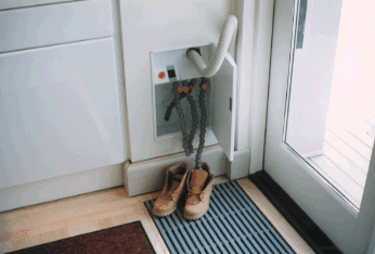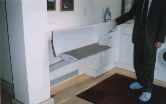 キッチン脇のアイロン台。アームがついており使いやすい位置に動かすことができる。洗濯乾燥機の横の作業台には、下から温風が吹き出すセータードライヤーが組み込まれている。さらにデッキへの出入口には、ブーツドライヤーが設置されている。