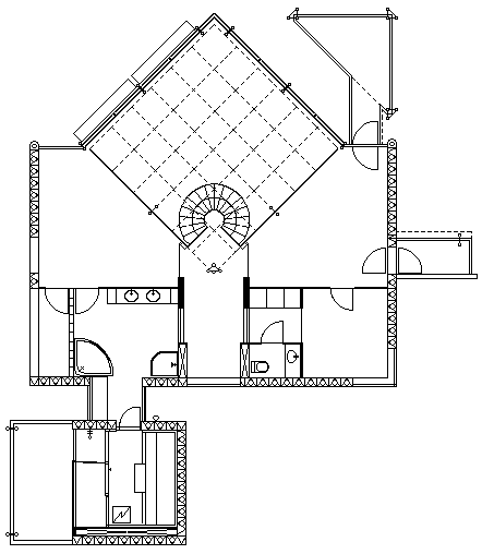 あくまでも開発された部材の検証と展示が目的で、多くのモデルハウスにあるような生活シーンを演出する家具調度品類は皆無であるが、必ずしも居住できないプランではない。これは躯体や外壁エレメント、内壁エレメントなどの検証を考えたからであろう。