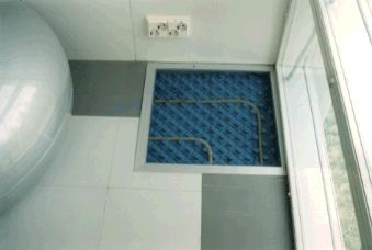 浴室の床はリサイクルプラスチックスを使ったタイルで仕上げられているが、サイズが大きすぎて変形が大きく、床面がでこぼこしまっている。