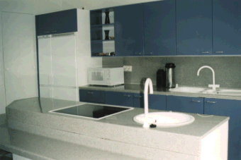 ポリエステル人造大理石をワークトップに使った市販のキッチンシステムをそのまま使っている。