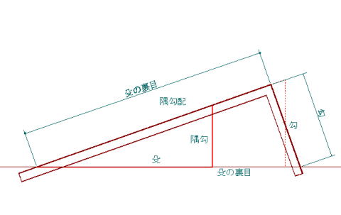 指金を用いて隅勾配を引くには、指金の短手に平勾配を取り、長手で殳の裏目を取ると、長手側が隅勾配になる。