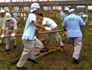 神楽桟の巻き手とコロ送りの、調子を合わせることがポイントである。コロは進行方向に対して常に直角に向くようにする。